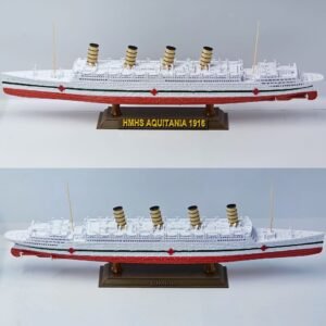 O RMS Aquitania, lançado em 1914 pela Cunard Line, foi um dos mais icônicos transatlânticos britânicos, conhecido como o “navio das quatro chaminés” e celebrado por sua elegância e longevidade em serviço. Em 1915, durante a Primeira Guerra Mundial, foi convertido em HMHS Aquitania (His Majesty’s Hospital Ship), atuando como navio-hospital no resgate e tratamento de soldados feridos, tornando-se uma peça fundamental da história naval e militar.