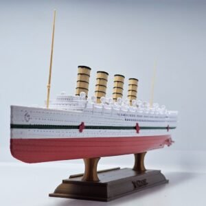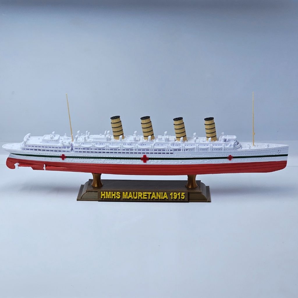 Navegue pela história com esta incrível miniatura do HMHS Mauretania, companheiro de frota do famoso Lusitania. Renderizado em sua icônica configuração de navio-hospital da Primeira Guerra Mundial, esta é uma peça de colecionador impressionante, perfeita para entusiastas da história e do modelismo naval.