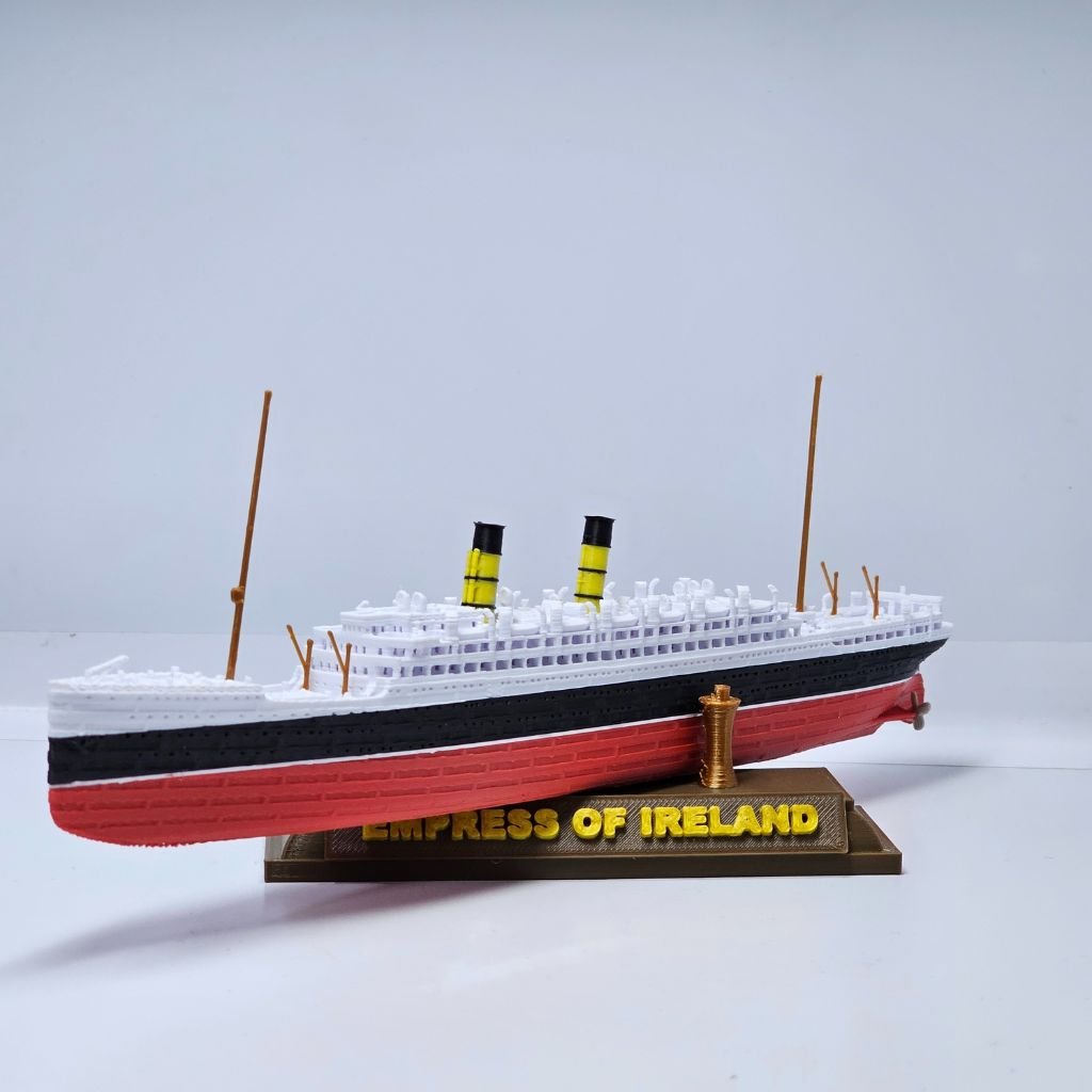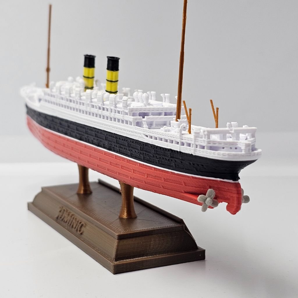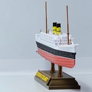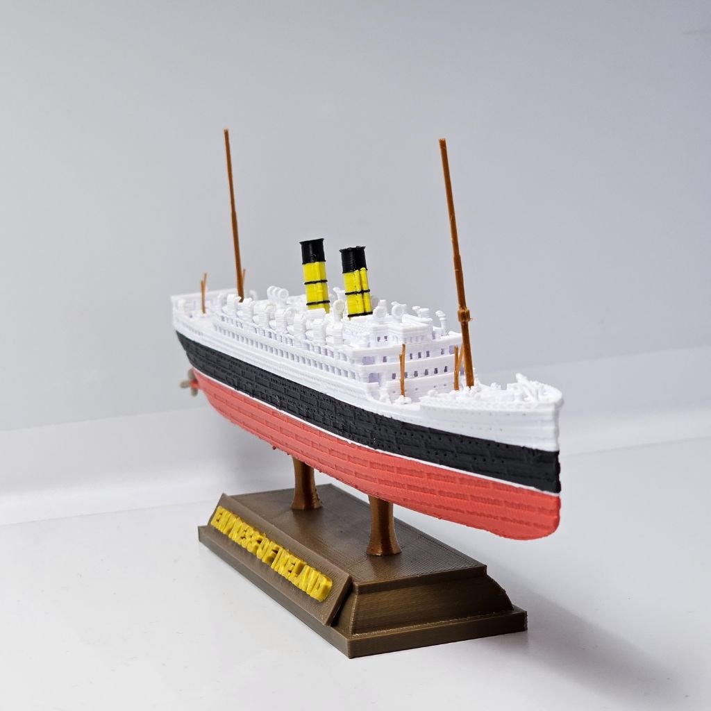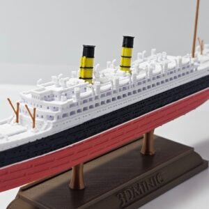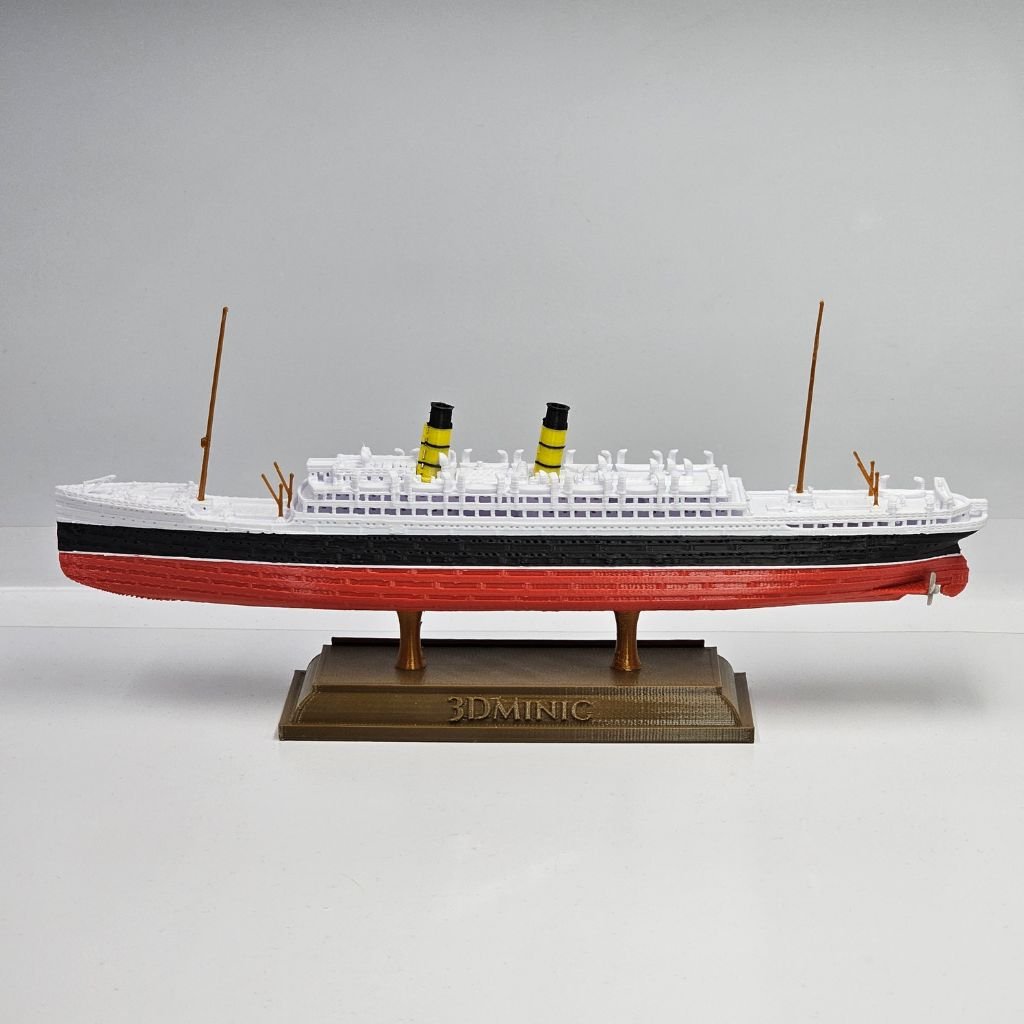 Esta miniatura em escala 1:750, com 23,3 cm de comprimento, recria fielmente o elegante transatlântico com suas duas chaminés e perfil característico. Produzido em plástico PLA de alta resistência, não recebe pintura — sua cor é a própria do material, o que garante durabilidade permanente, sem risco de descascar.