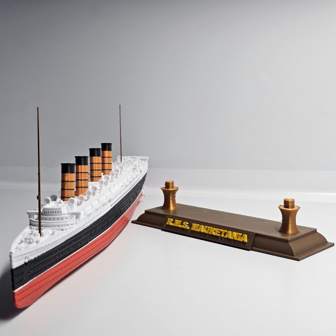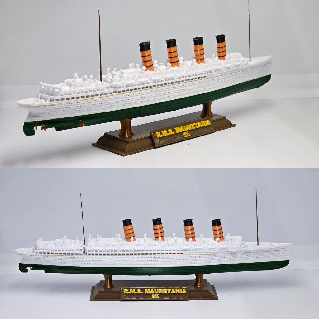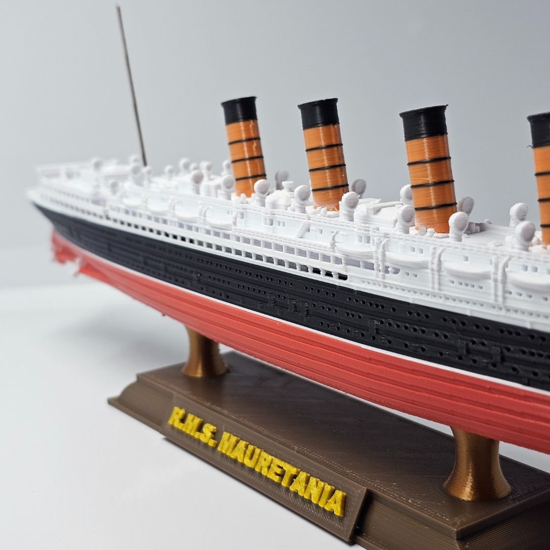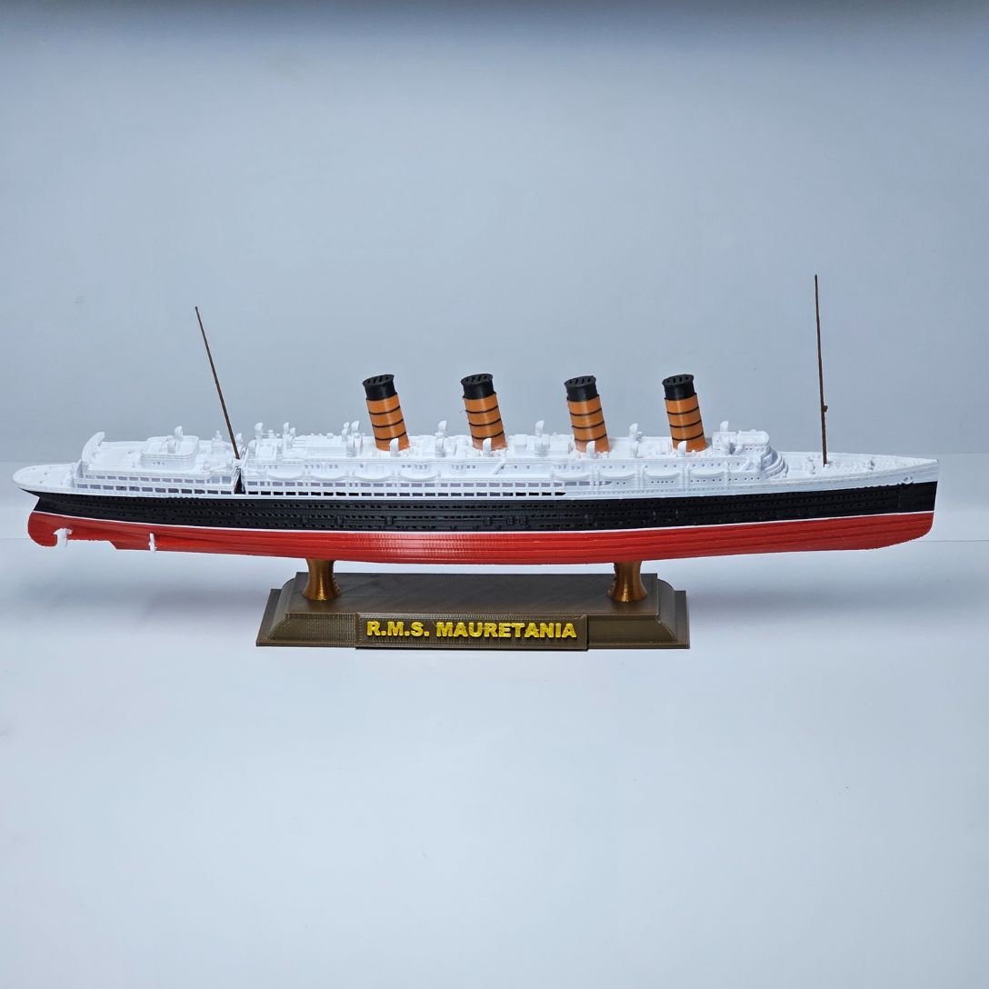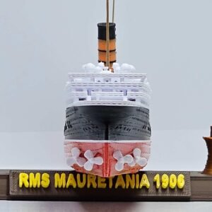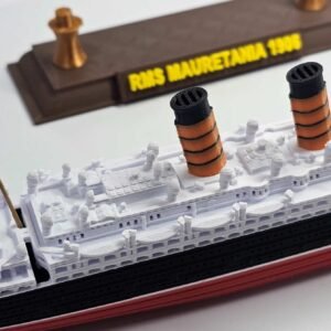 Esta miniatura em escala 1:750, com 32 cm de comprimento, reproduz fielmente a silhueta marcante do Mauretania, destacando o casco negro, a superestrutura branca e as quatro chaminés vermelhas com topos pretos — símbolos de sua imponência.