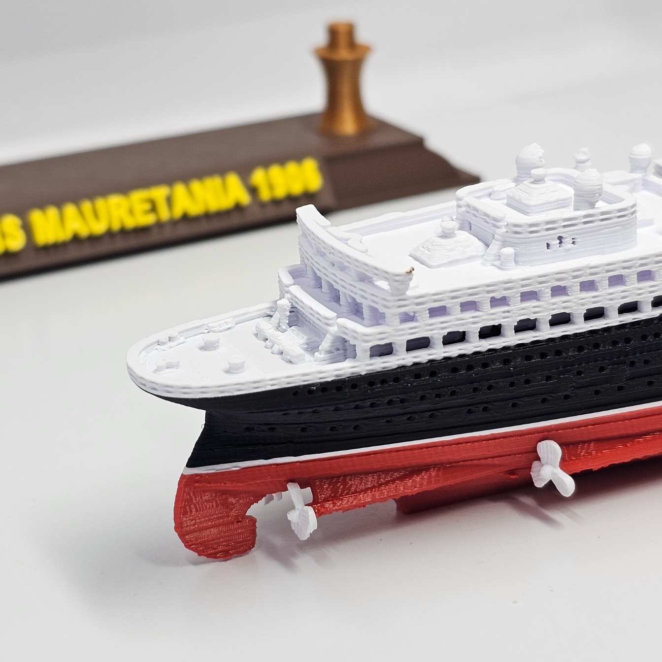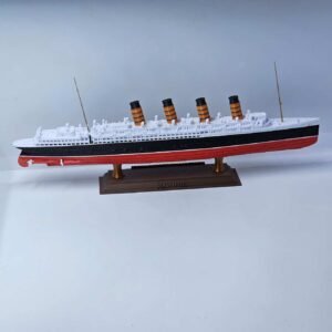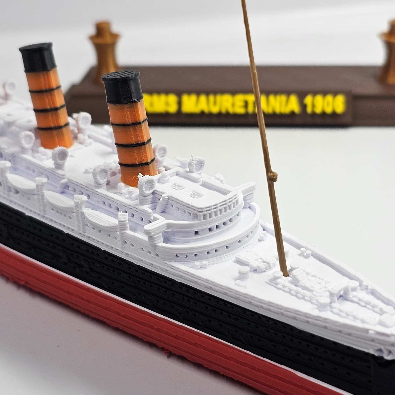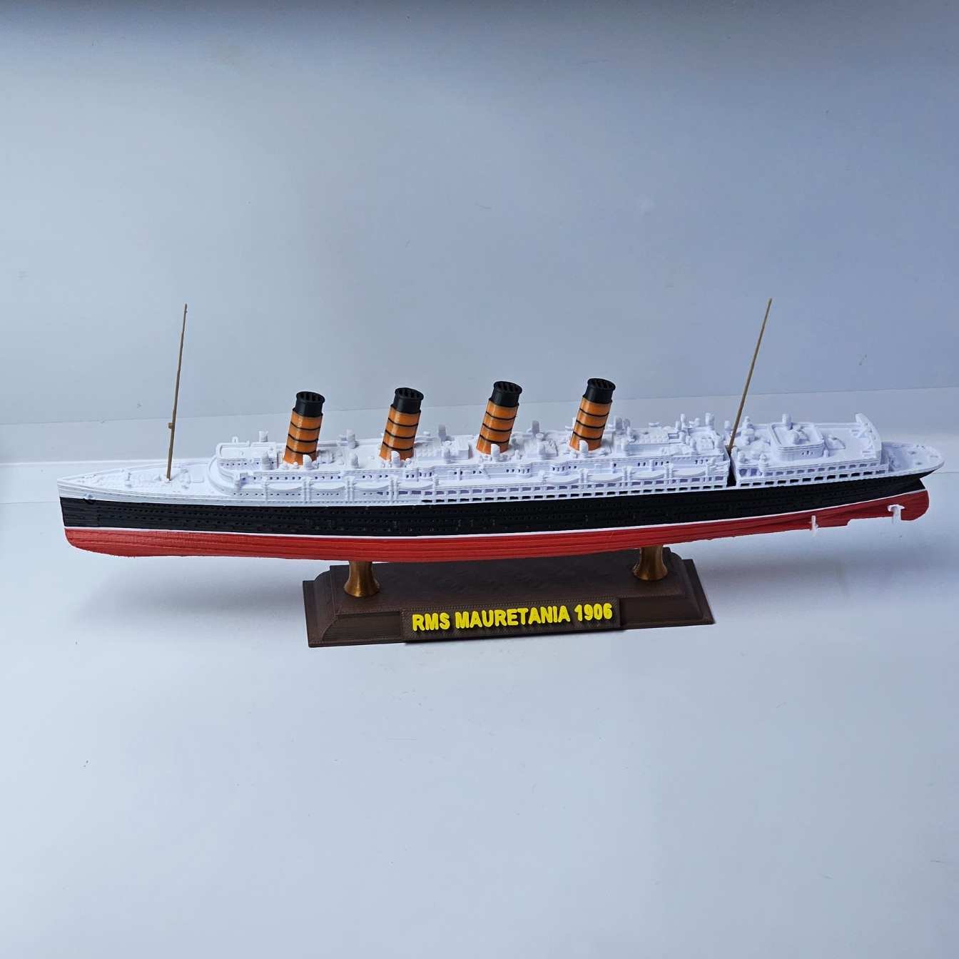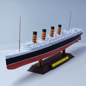 Esta miniatura em escala 1:750, com 32 cm de comprimento, reproduz fielmente a silhueta marcante do Mauretania, destacando o casco negro, a superestrutura branca e as quatro chaminés vermelhas com topos pretos — símbolos de sua imponência.