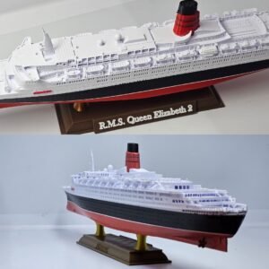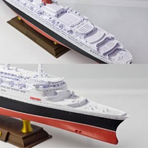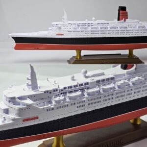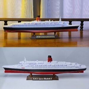 Esta miniatura em escala 1:750 com 39,2 cm de comprimento recria com precisão a silhueta marcante do QE2, com sua chaminé vermelha característica e linhas modernas que o diferenciaram de seus antecessores.