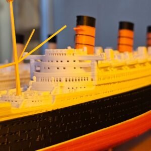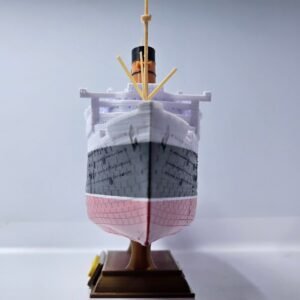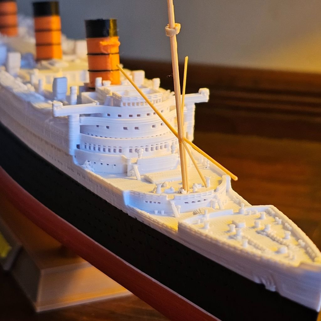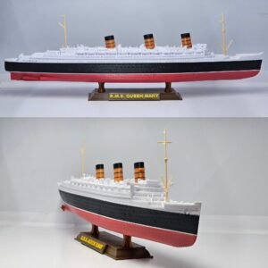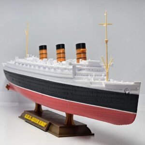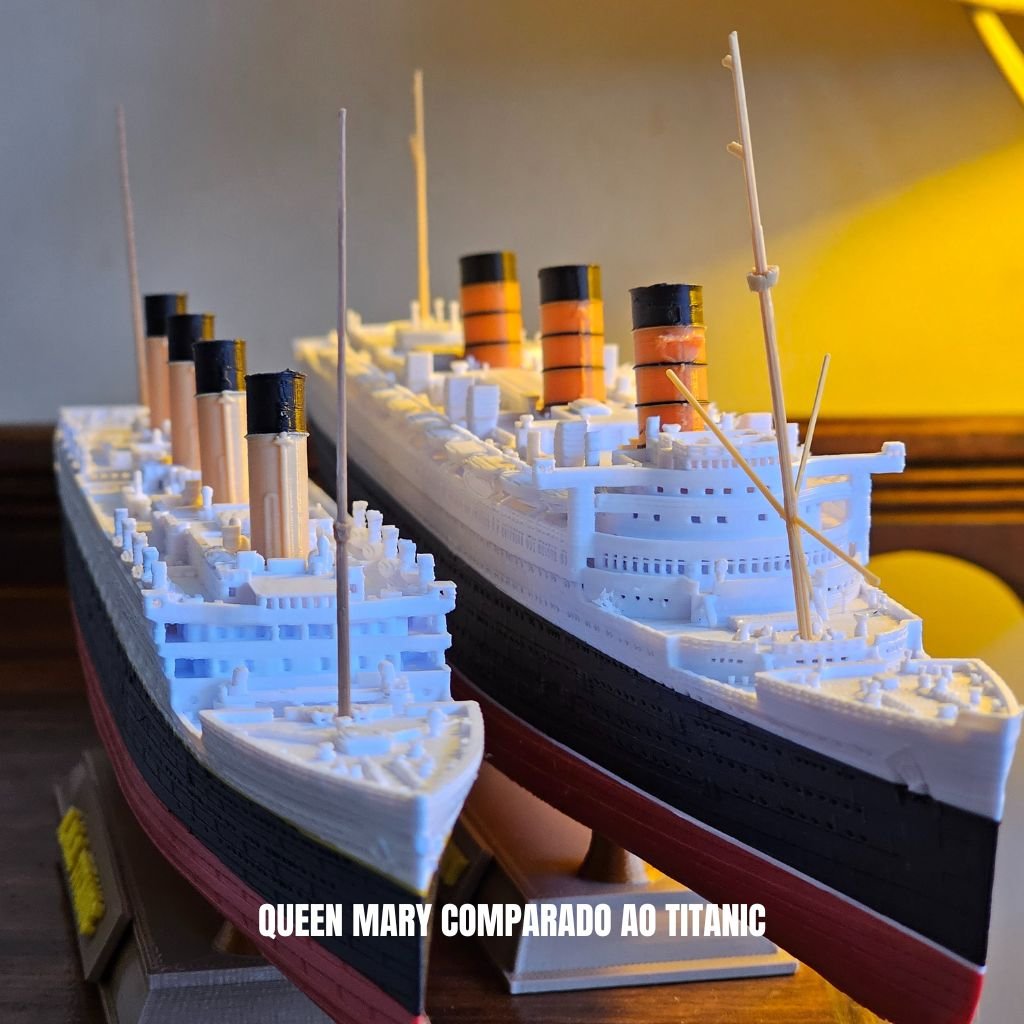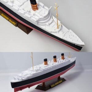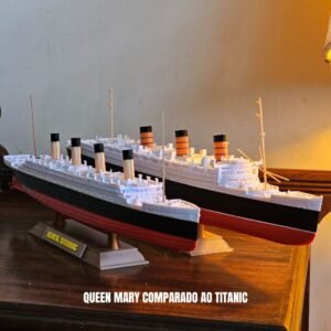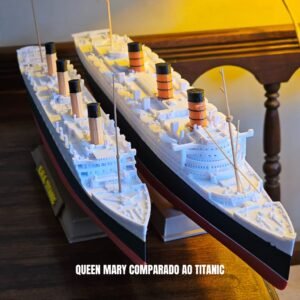 Esta miniatura em escala 1:750, com 41,3 cm de comprimento, reproduz com fidelidade as linhas clássicas do Queen Mary, destacando o casco negro, a superestrutura branca e as chaminés vermelhas com topos pretos que marcaram época.
