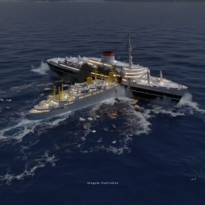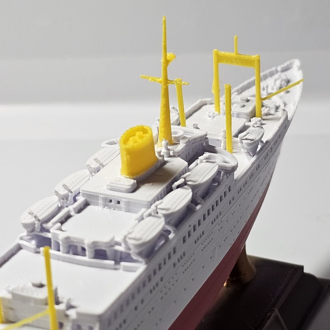 Produzido em plástico PLA de alta resistência, o modelo possui cores permanentes, sem pintura, garantindo durabilidade e evitando riscos de descascamento ou desbotamento. Uma peça única que presta homenagem a um dos transatlânticos mais resilientes da história naval.